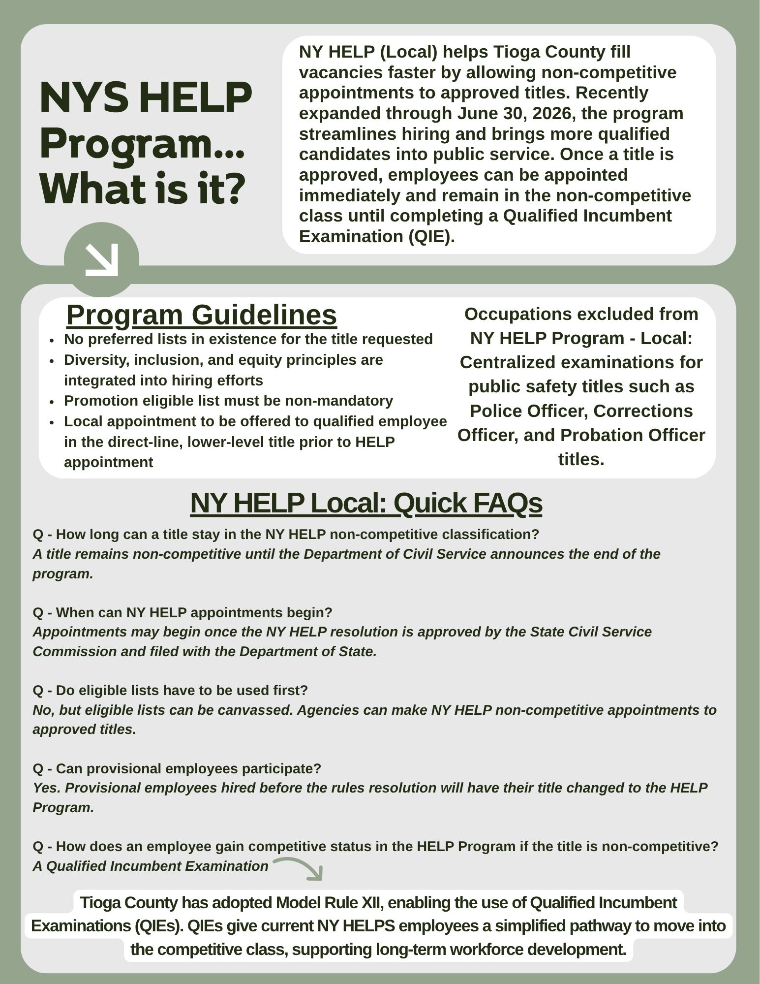 The Hiring Emergency Limited Placement Program (HELP Program) is in effect for Tioga County. This temporary program allows Tioga County to hire for the following titles without participating in the Civil Service exam or being appointed from an Eligible List:
